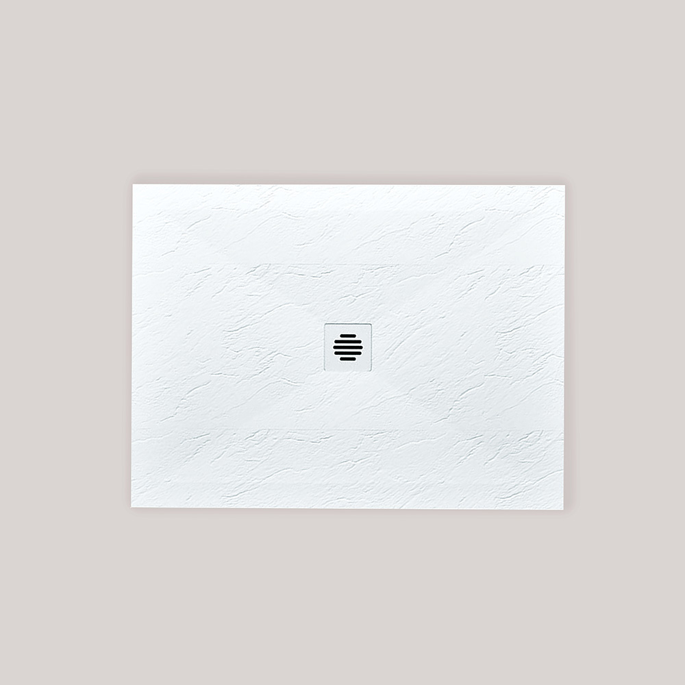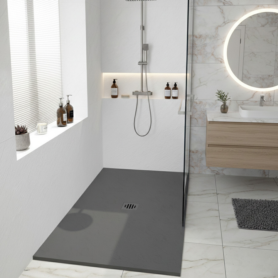 Crafted for strength and modern elegance, this resin solid slate shower base features high-pressure molded construction for superior durability and structural integrity. Its textured surface is available in white, grey, and black, delivering a natural slate look with enhanced slip resistance. Designed for seamless integration, it includes a custom-made tile flange installation for a secure, watertight fit in any bathroom design.